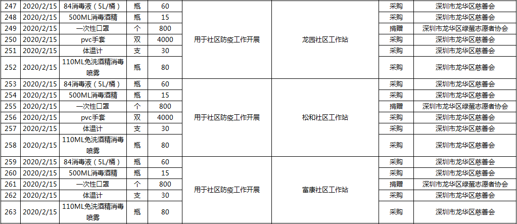 深圳市龙华区慈善会“心系湖北 守护龙华”项目接收款物清单