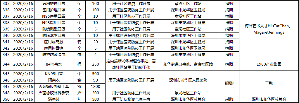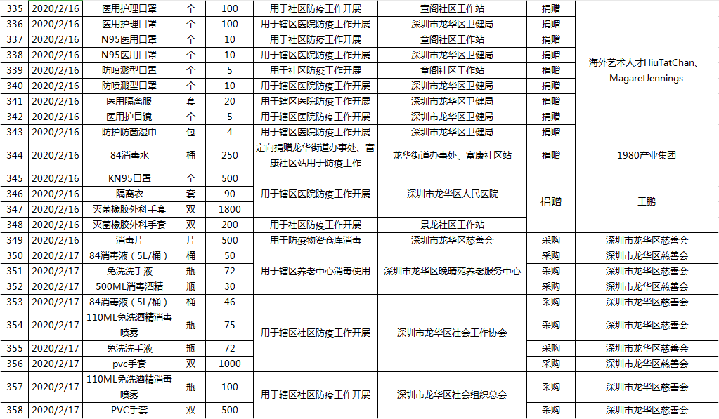 深圳市龙华区慈善会“心系湖北 守护龙华”项目接收款物清单